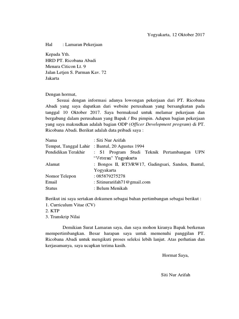 Contoh surat lamaran kerja di perusahaan swasta i. Dalam pembuatan surat lamaran kerja di pt anda harus menulis posisi yang sesuai dengan yang dibutuhkan pt tersebut. Baik mereka yang baru lulus kuliah s1 atapun mereka yang lulus sma atau smk. Dan panduan tips melamar kerja agar cepat. Contoh surat lamaran kerja lulus sma / smk di pt. Contoh surat lamaran kerja di pt sebagai karyawan. Contoh surat lamaran kerja adalah suatu hal yang sangat dibutuhkan oleh para orang yang sedang mencari pekerjaan yang sesuai dengan keinginannya. Saya akan memberikan contoh surat lamaran kerja yang baik dan benar. Surat lamaran kerja adalah suatu dokumen resmi yang harus kita buat jika ingin melamar suatu pekerjaan, baik itu di pabrik, di toko, di kantor beberapa contoh surat lamaran kerja mungkin akan memudahkan anda untuk memahami bagaimana cara menyusun surat lamaran kerja dengan baik. Contoh surat lamaran kerja yang baik dan benar untuk dijadikan referensi dalam usaha mencari kerja di sebuah perusahaan sesuai dengan keahlian kamu. √ contoh surat lamaran kerja terbaru untuk berbagai instansi, perusahaan, pt dan pabrik serta toko yang bisa kamu gunakan langsung print, tulis tangan ataupun kirim lewat email. Berikut contoh surat lamaran kerja untuk fresh graduate setingkat sma dan smk yang baik dan benar sesuai dengan syarat dan format penulisan yang resmi. Berikut contoh surat lamaran pekerjaan yang bisa kamu download file dokumennya juga, link di bagian akhir artikel.